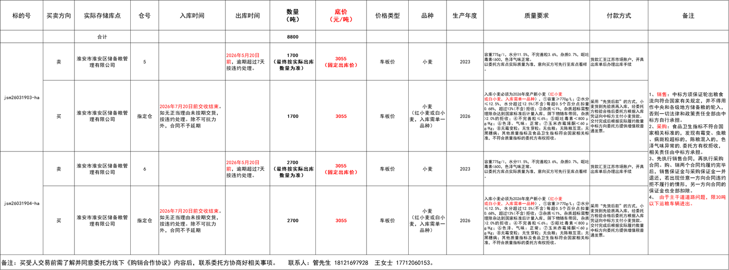 本次交易采用購銷雙向競價(jià)(以銷競采)模式,即委托方與競價(jià)方通過一次交易同步實(shí)現(xiàn)同等數(shù)量糧油的采購和銷售。以銷競采模式下,競價(jià)參與方只對采購標(biāo)的底價(jià)進(jìn)行競價(jià),一旦采購標(biāo)的物應(yīng)價(jià)成交,則相應(yīng)銷售標(biāo)的物以交易清單中公布的價(jià)格成交,采購價(jià)格以競價(jià)交易結(jié)果為準(zhǔn)。通過一次交易實(shí)現(xiàn)購銷雙向交易,競價(jià)參與方須仔細(xì)閱讀本交易公告、清單及其他相關(guān)文件,謹(jǐn)慎評估自身風(fēng)險(xiǎn)承擔(dān)能力和市場、政策風(fēng)險(xiǎn),衡量決定是否參與交易,一旦參與,須承擔(dān)相應(yīng)的風(fēng)險(xiǎn)和責(zé)任,自覺履行相關(guān)義務(wù)。中標(biāo)方須保證輪出小麥流向符合國家有關(guān)規(guī)定,并不得用作各級儲備小麥的輪入,否則一切法律和政策責(zé)任全部由中標(biāo)方自行承擔(dān)。