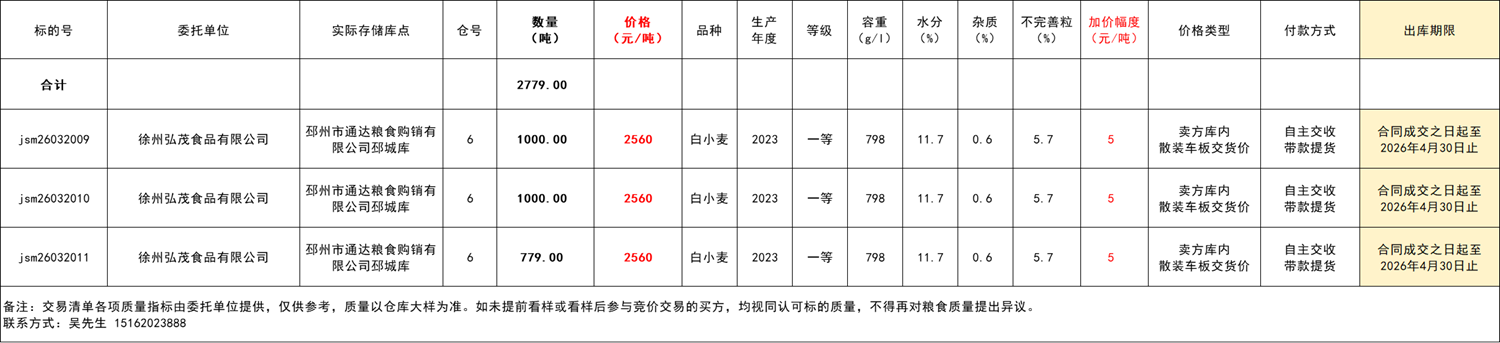 質(zhì)量:公告中提供的質(zhì)量指標(biāo)由委托單位提供,僅供參考。競購方須到庫點(diǎn)看樣(看樣時間需提前預(yù)約,聯(lián)系人:吳先生 ******),以確保對質(zhì)量及保管狀況有充分了解。如競購方未進(jìn)行看樣,則在成交后應(yīng)自覺履行各項(xiàng)義務(wù),且不得以質(zhì)量問題為由提出異議或申請商務(wù)處理。