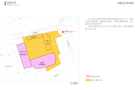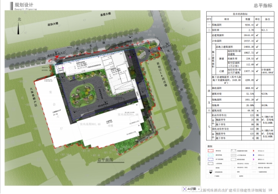 建設(shè)內(nèi)容:本次改擴(kuò)建項(xiàng)目保留范圍為南樓和宴會(huì)大廳,拆除北樓和東樓,新建11層賓館主樓及3層裙房。該項(xiàng)目總建筑面積為29145.97平方米,容積率為2.78,建筑密度為52.51%,綠地率為20%,配建停車位123輛。